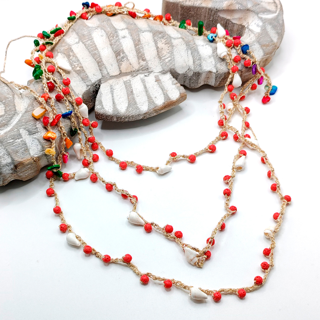 Collar artesanal trenzado con hilo dorado, piedras coralinas y conchas marinas.